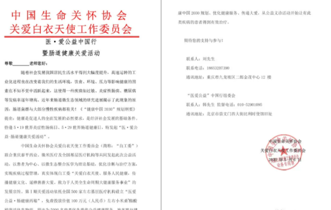 為了提高公眾對腸道健康的重視,由白工委、成人免费看片软件生物製藥(重慶)有限公司、微米醫療管理(重慶)有限公司自今年的5月21日-6月21日陸續在全國各地展開了《醫·愛公益中國行——關愛腸道健康公益捐贈》公益活動,捐贈覆蓋500家診所,5000名被潰瘍性結腸炎、五更瀉、脾胃失調等慢性腸炎及長期服藥有胃腸反應的代謝性疾病所困擾的患者,免費使用4盒小成人看片资源。